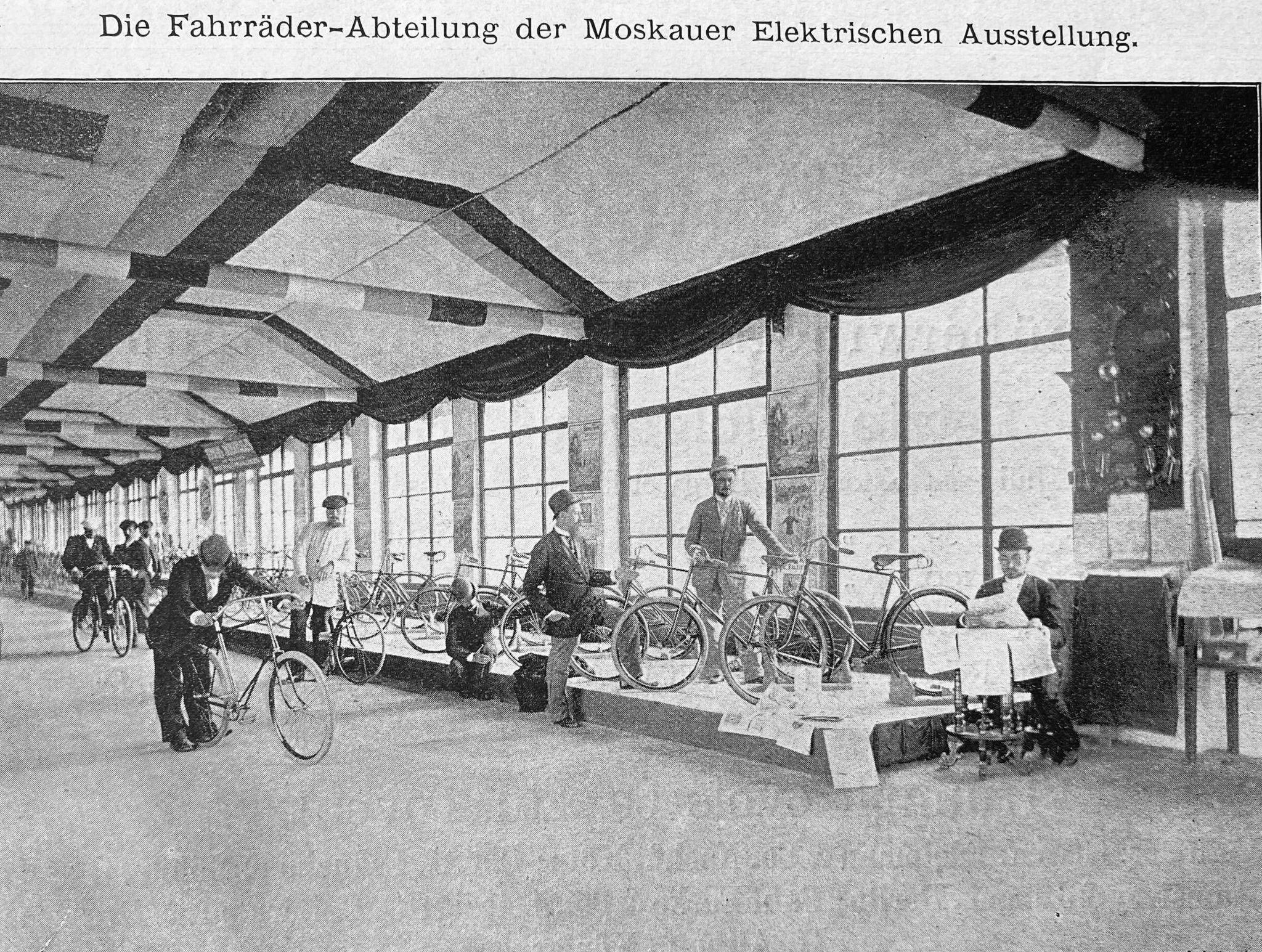 Section consacrée aux bicyclettes lors d’une exposition industrielle à Moscou, vers les années 1880 : le cycle y apparaît encore comme une innovation technique, avant l’émergence des salons spécialisés.