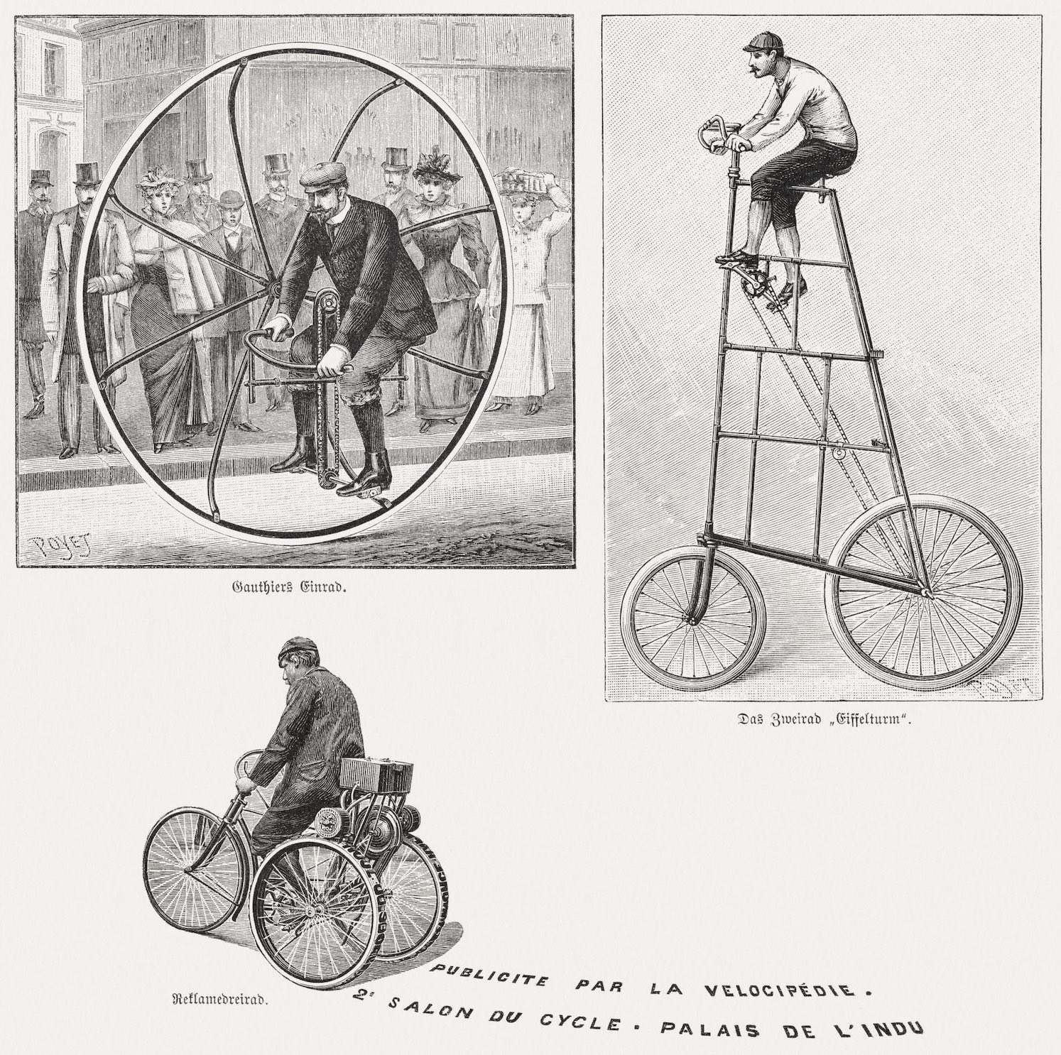 Modèles expérimentaux et vélocipèdes atypiques illustrant les débuts encore inventifs et spectaculaires des salons du cycle.