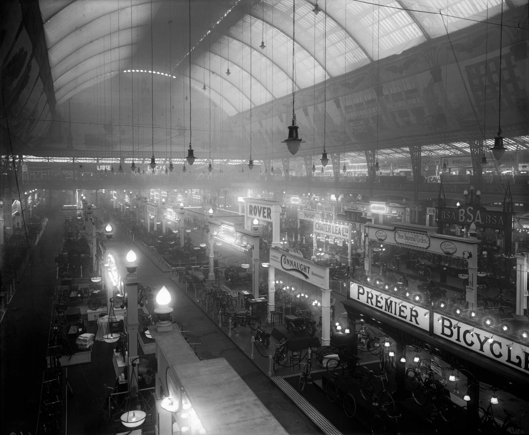 Grand hall d’exposition organisé en stands de marques (Rover, BSA, Premier…), illustrant la structuration commerciale du marché du cycle et l’essor des salons modernes.