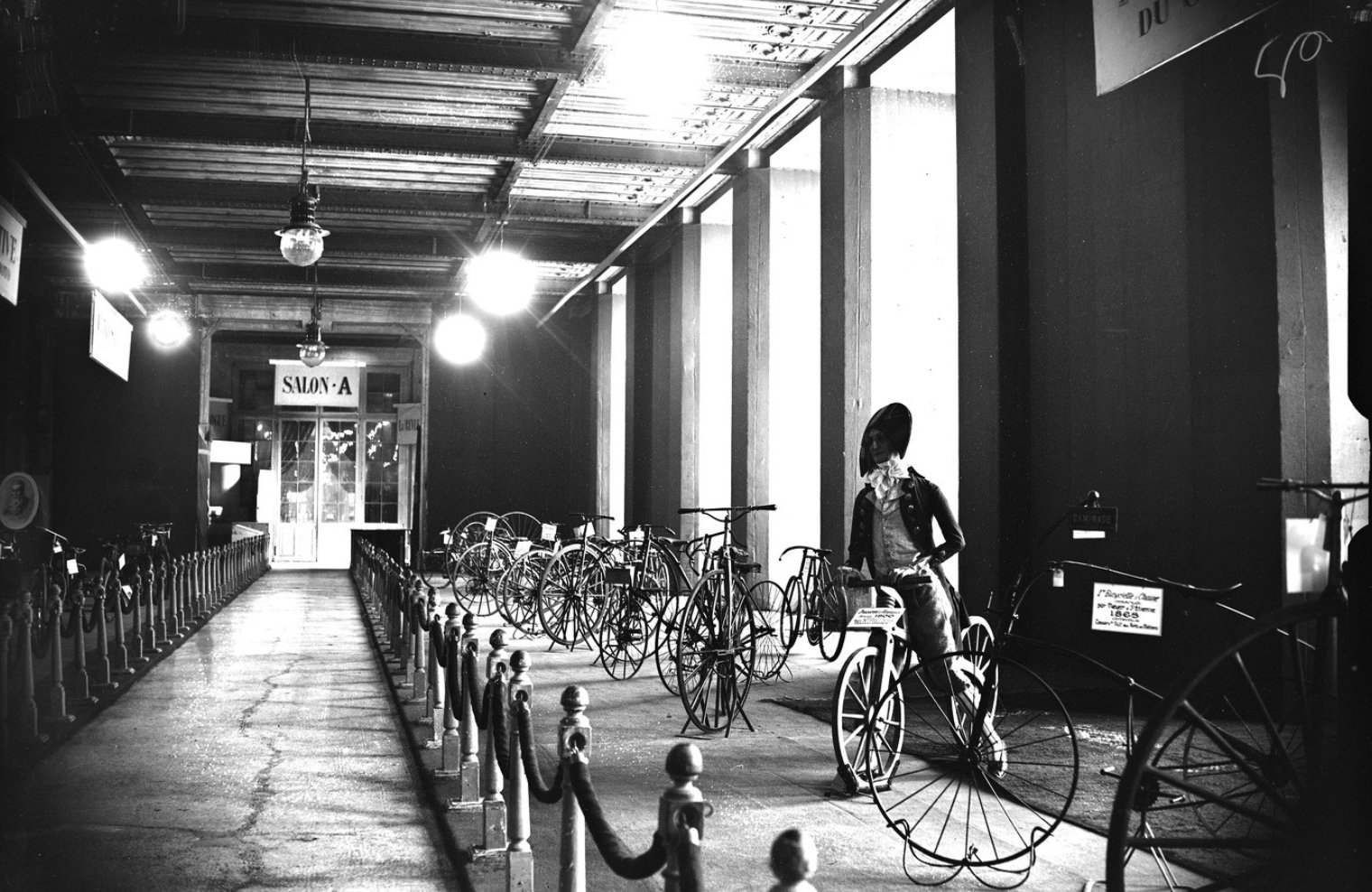 Présentation scénographiée de bicyclettes anciennes, organisée en parcours avec cordons et mannequins, témoignant de l’évolution du cycle et de la transformation des salons en lieux de mémoire technique. Source : gallica.bnf.fr