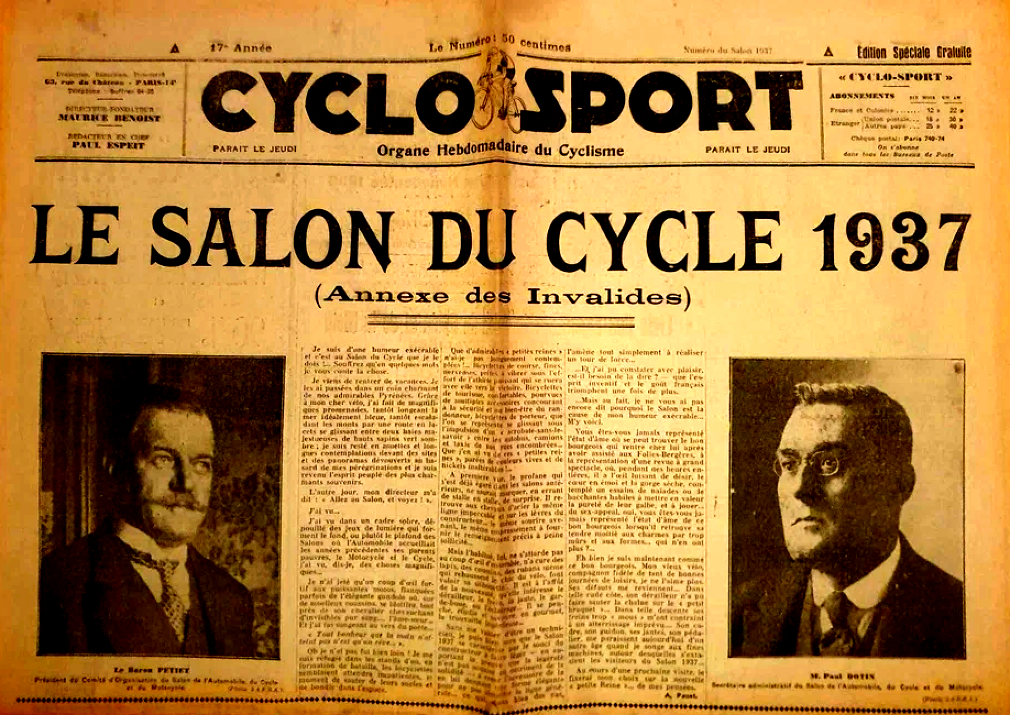 Dans ce numéro spécial de Cyclo-Sport consacré au Salon du Cycle 1937, le ton est celui d’une visite vivante et un peu ironique : d’abord réticent, l’auteur découvre un salon où la bicyclette n’est plus seulement une machine, mais un objet de modernité, de spectacle et de désir. Source : presse spécialisée d’époque