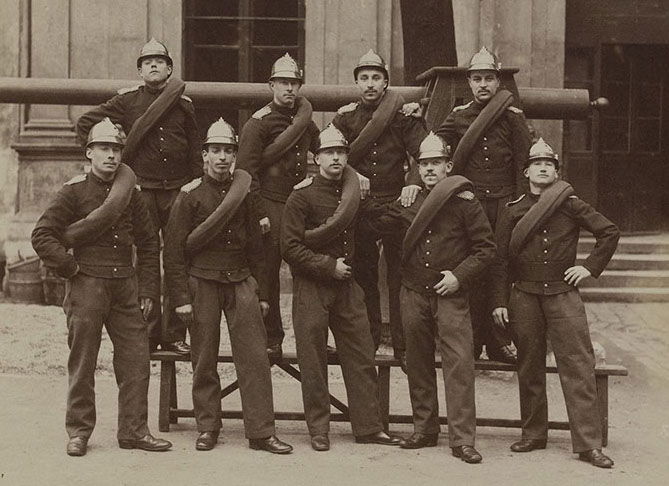 11ème Compagnie de sapeurs-pompiers de la caserne de la rue de Sévigné en tenue de représentation, 3ème arrondissement, Paris, vers 1894. Mulot, L. (dit Mulot Fils), Photographe Vers 1894 Musée Carnavalet, Histoire de Paris