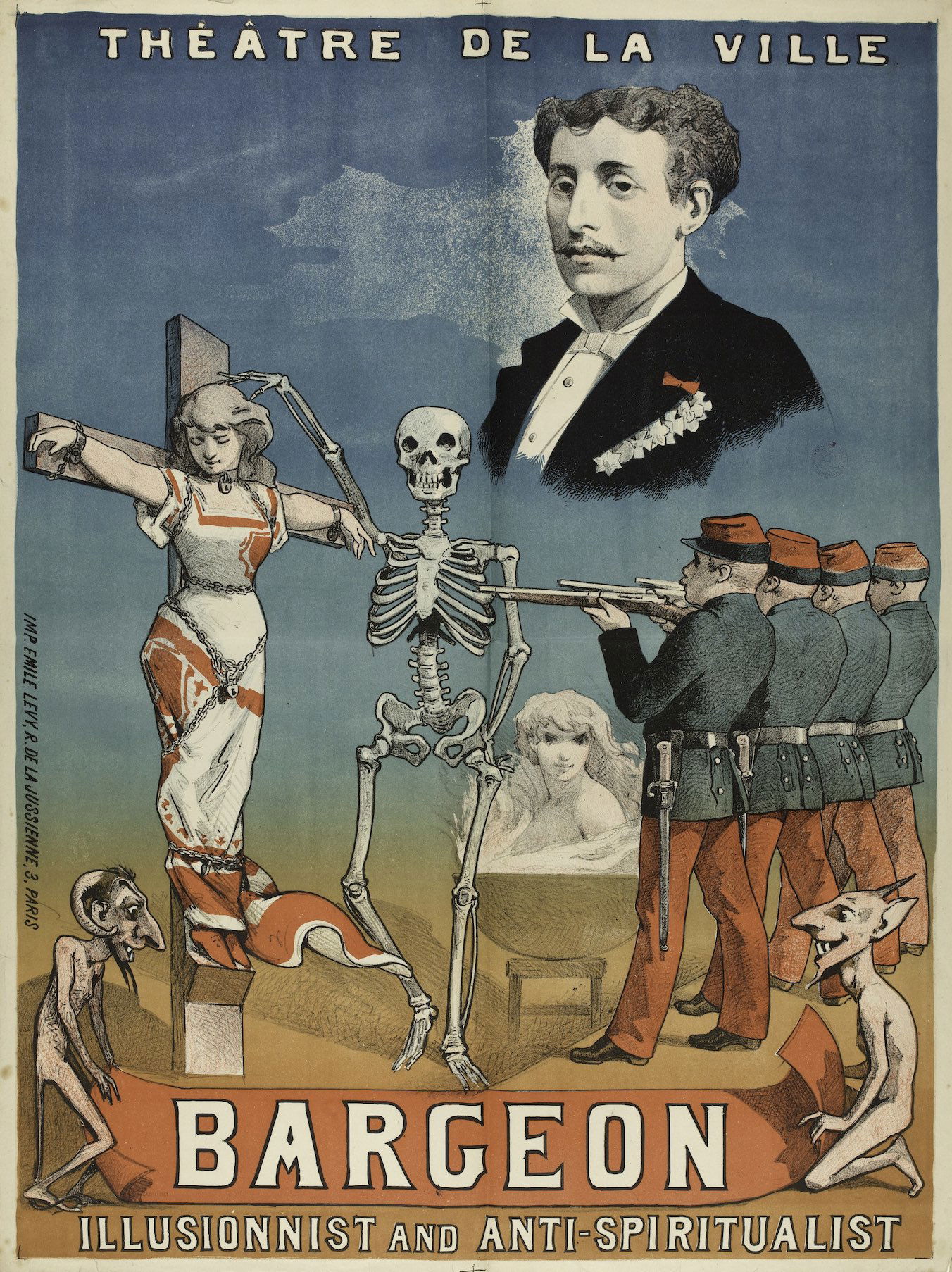 En 1883, Bargeon se produit au Théâtre de la Ville à Paris, où il se présente explicitement comme illusionniste et « anti-spiritualiste », une posture encore peu courante à une époque marquée par l’essor du spiritisme. Ses spectacles semblent s’appuyer sur des mises en scène volontairement spectaculaires, jouant avec les thèmes de la mort, de l’exécution et de la résurrection apparente, afin de démontrer que l’illusion relève de l’artifice et non du surnaturel.