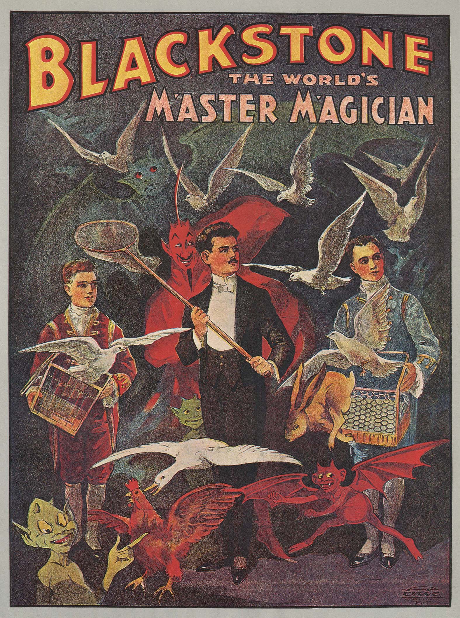 Une affiche intitulée Blackstone, le maître magicien du monde, réalisée vers 1920, imprimée par The Erie Lithographic and Printing Co. à Erie (Pennsylvanie), est aujourd’hui conservée dans la collection Jay Marshall à Chicago.