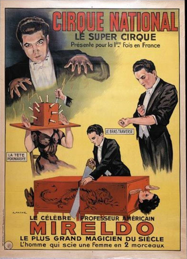 Parmi ses numéros les plus mémorables figure la femme sciée en deux, illusion emblématique qui, dès les années 1900–1910, fascine le public par son audace technique et la violence apparente du geste. Mireldo excelle également dans d’autres illusions saisissantes telles que le bras traversé ou la tête poignardée, renforçant sa réputation de maître de l’impossible. Son passage en France, dans les années 1910–1920, contribue à enrichir la longue tradition des arts de la scène, à une époque où l’illusion, la mécanique et le mystère occupent une place centrale dans l’imaginaire collectif et dans le cœur du public.