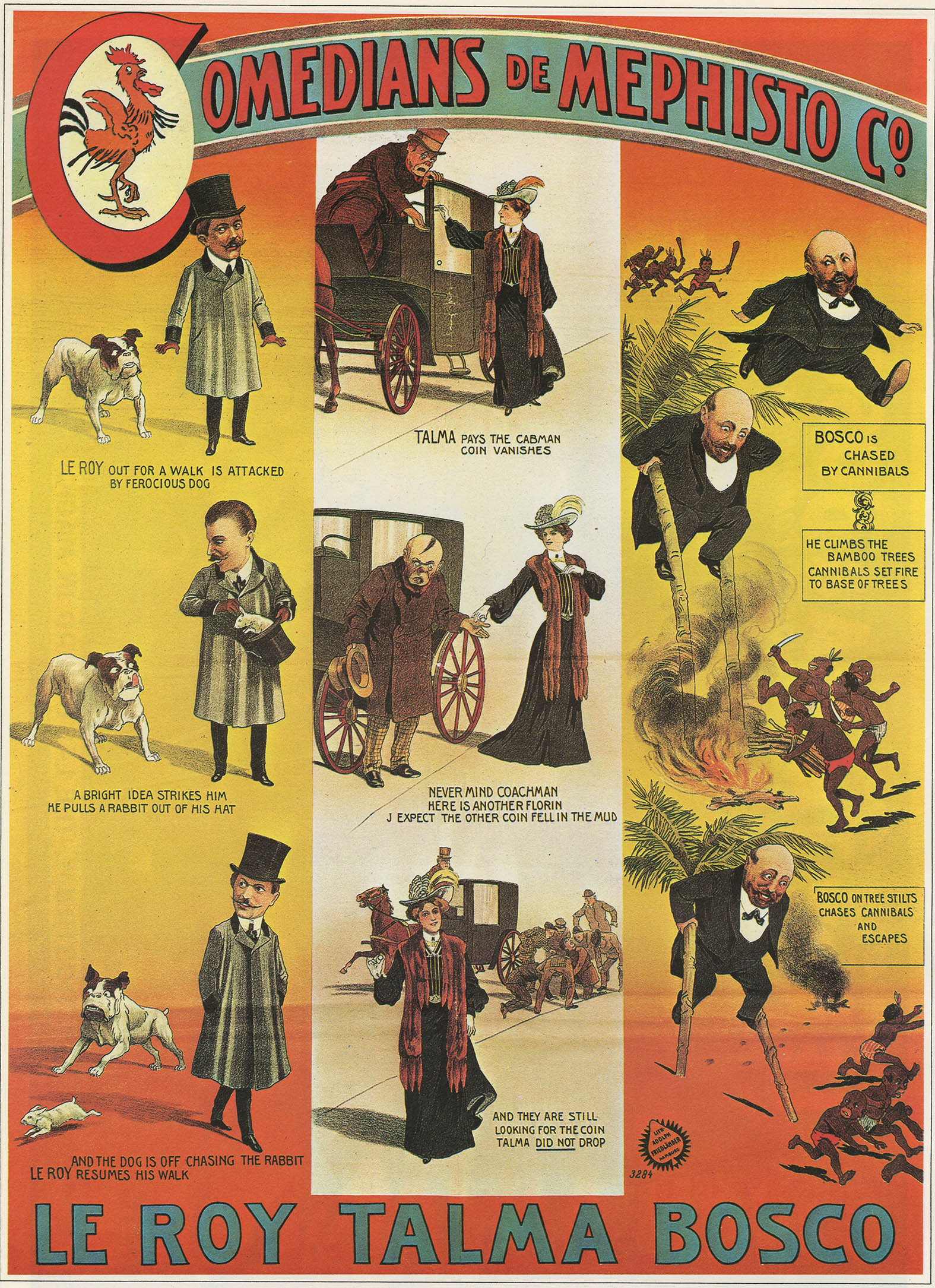 Vers 1905, cette affiche illustre le spectacle Les Comédiens de Méphisto, présenté par Servais Le Roy avec Talma et Bosco. Conçue comme une succession de scènes, elle met en image la complémentarité du trio : magie élégante et maîtrisée pour Le Roy, dextérité et mystification pour Talma, comique visuel et situations burlesques pour Bosco. L’ensemble témoigne d’une magie spectaculaire mêlant illusion, humour et exotisme, caractéristique des grandes scènes populaires du début du XXᵉ siècle.