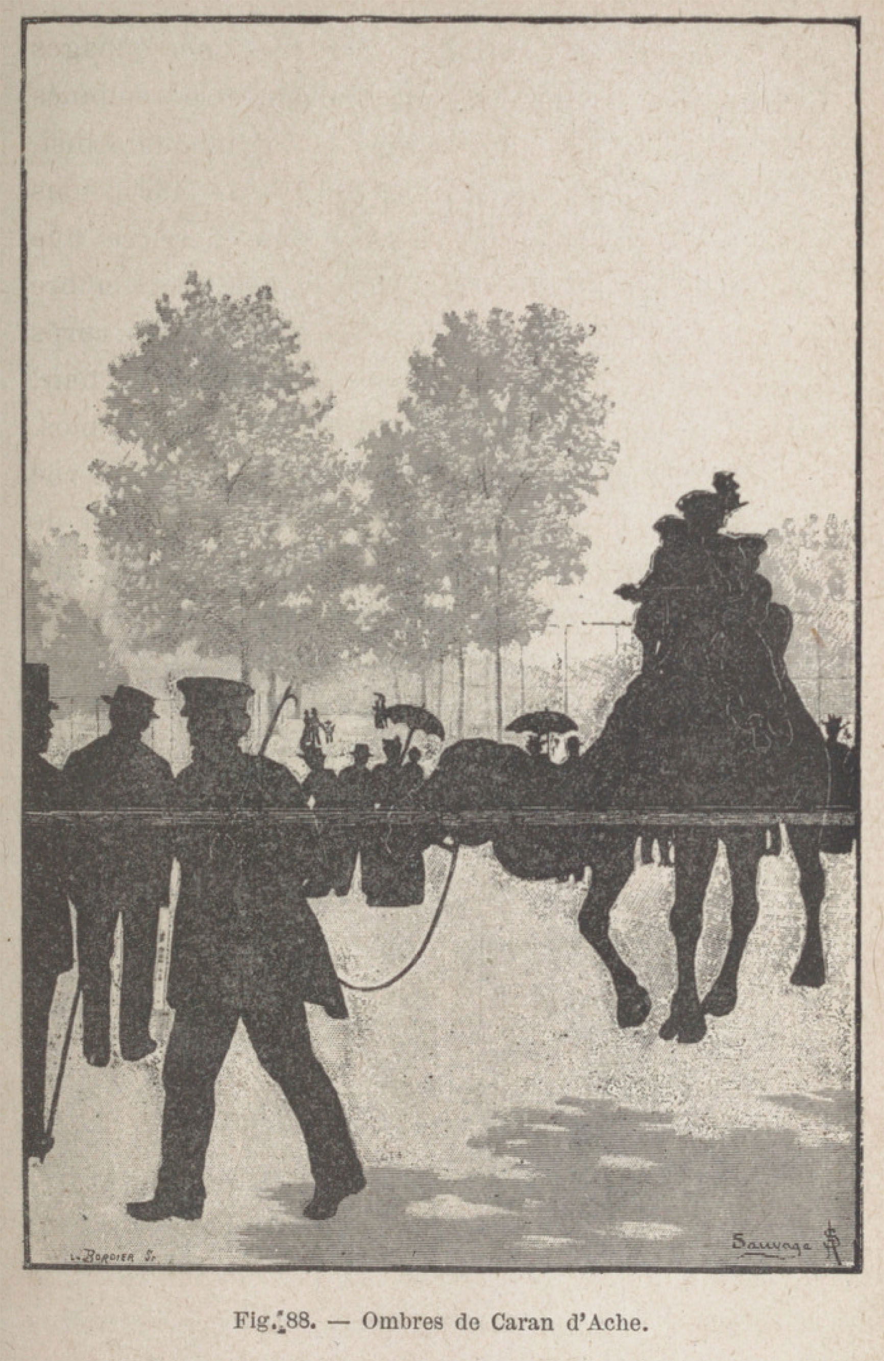 Depuis cette époque, ce genre de spectacle s'est un peu répandu; le théâtre du Chat-Noir continue à faire admirer les créations de Caran d Ache et de quelques autres artistes, et le prestidigitateur Alber donne, dans les salons, des représentations analogues. La figure 88 représente une scène des ombres de Caran d'Ache.