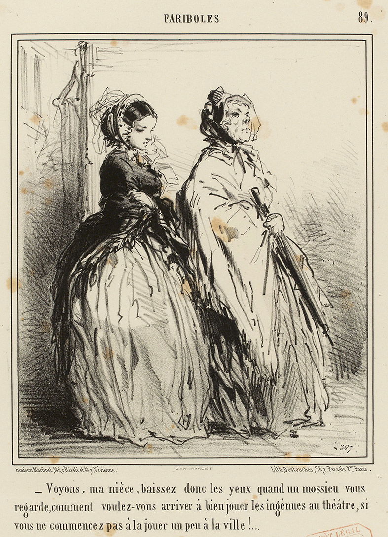 Cette planche de la série Fariboles, publiée en 1855, propose un regard satirique sur l’apprentissage du théâtre au XIXᵉ siècle. Deux femmes cheminent ensemble, et le conseil donné à la plus jeune révèle toute l’ambiguïté de l’époque : avant de savoir incarner l’ingénue sur scène, il faudrait d’abord apprendre à la jouer « à la ville ».
