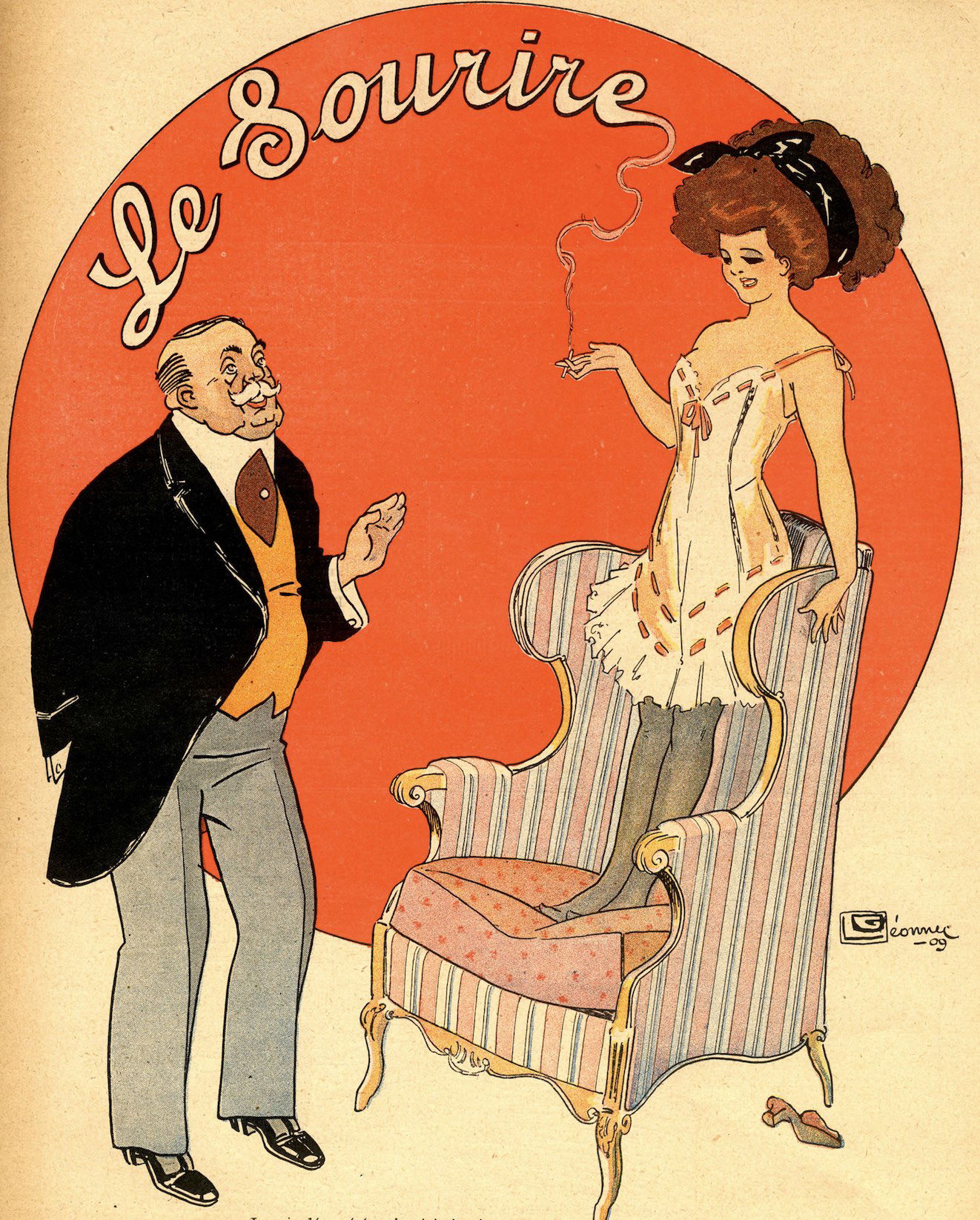 Couverture du journal Le Sourire (1909), dessinée par Léonnec. La scène joue sur l’élégance légère de la Belle Époque : un bourgeois moustachu, tout sourire, s’incline devant une jeune femme juchée sur un fauteuil, cigarette à la main. L’attitude mutine de la modèle, son corset souple et la fumée qui serpente traduisent l’esprit grivois mais raffiné de la presse illustrée de l’époque. Le Sourire cultivait ce ton piquant, entre humour mondain et sensualité légère, reflet d’un Paris où théâtre, galanterie et caricature faisaient bon ménage.