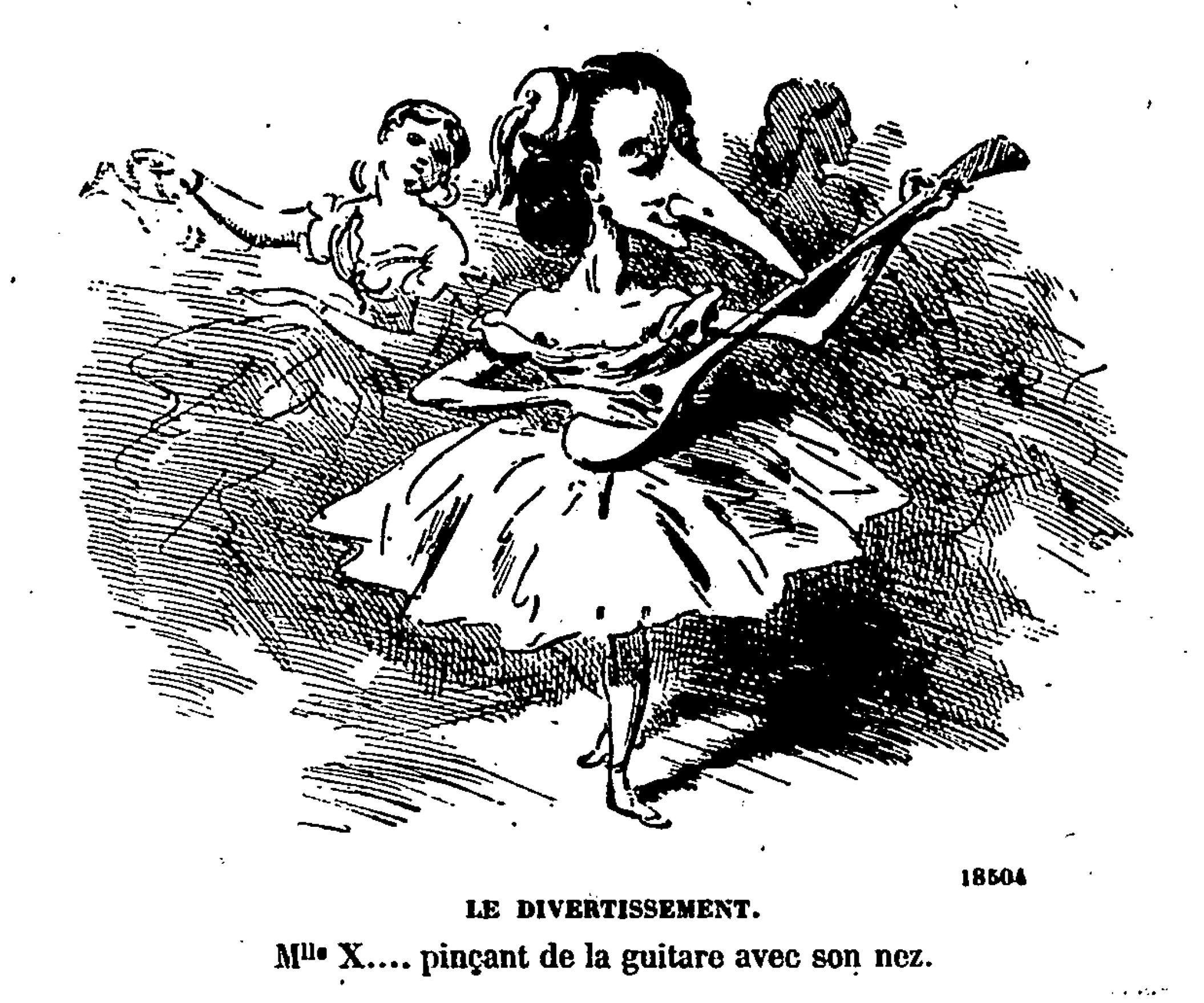 Le divertissement Mlle X… pinçant de la guitare avec son nez.