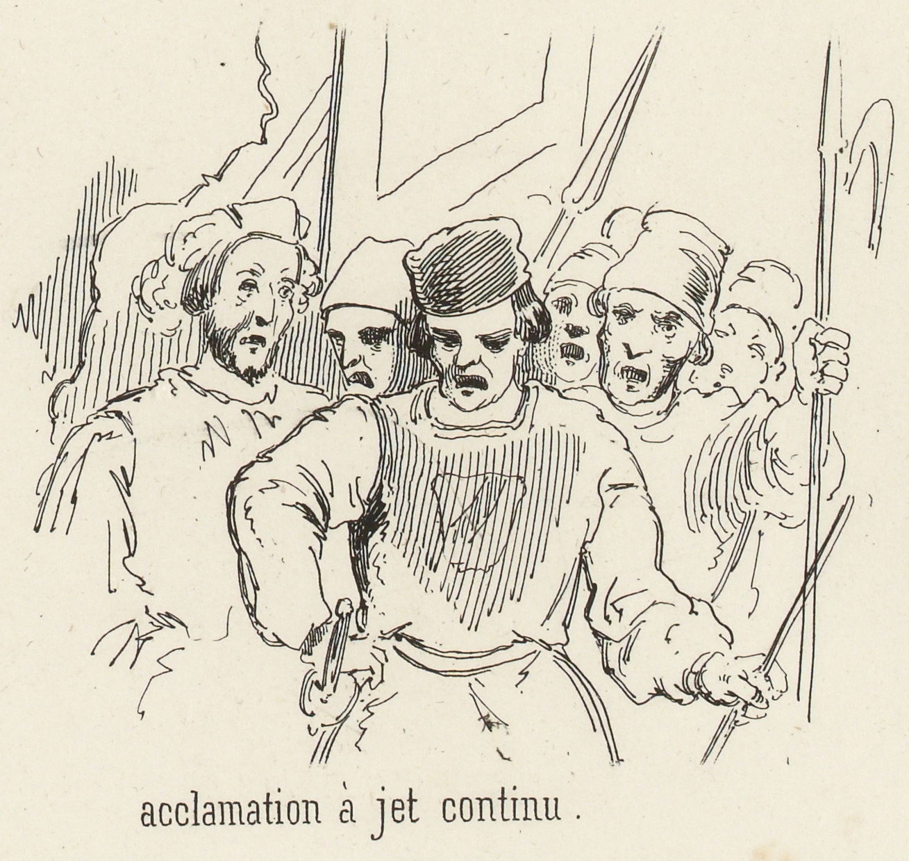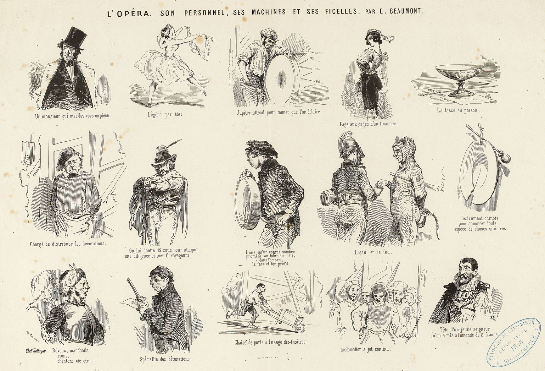 En 1848, Charles-Édouard de Beaumont croque l’Opéra comme une grande machine vivante, faite autant d’illusions que de ficelles. Sous des légendes ironiques, il dévoile les coulisses, les petits métiers, les figurants mal payés, les machinistes, les accessoires, les cabales et les effets sonores. Chaque vignette rappelle que le spectacle ne repose pas seulement sur les divas et les héros, mais sur toute une armée d’ouvriers de l’ombre. L’Opéra apparaît alors comme un monde complet : théâtre, atelier, champ de bataille et comédie humaine à la fois.