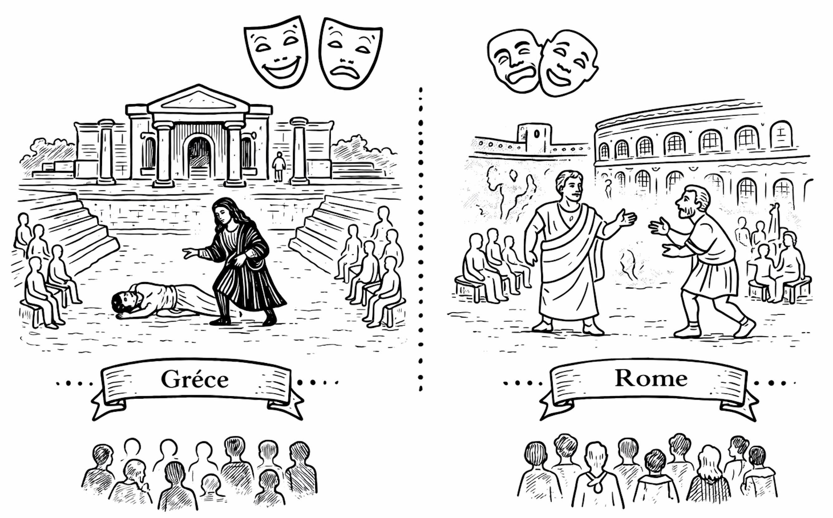De −500 à 200 environ : dans la Grèce antique, puis à Rome, naissent les premiers genres théâtraux structurés. La tragédie explore le destin des dieux et des héros, tandis que la comédie observe les faiblesses humaines. À Rome, le théâtre devient progressivement un divertissement plus populaire.