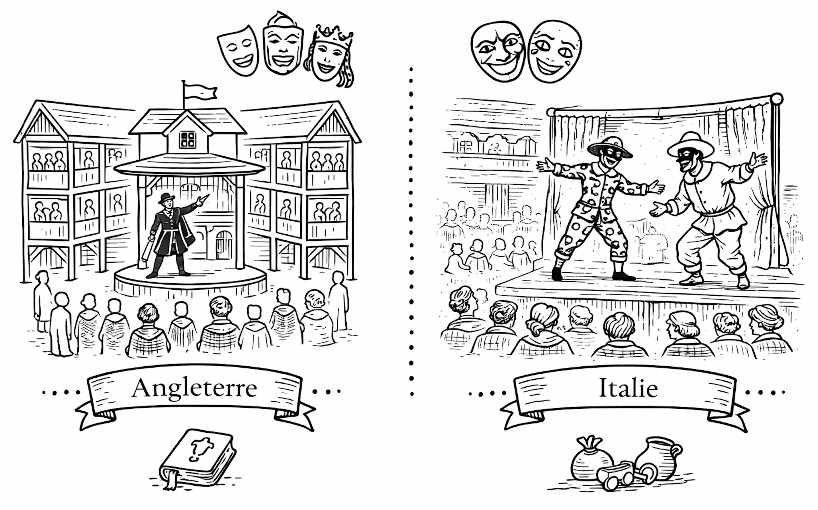De 1550 à 1620 environ : à la Renaissance, les genres se diversifient. En Angleterre, le théâtre élisabéthain mêle tragédie, comédie et drame historique. En Italie, la commedia dell’arte s’impose avec ses personnages masqués et son art de l’improvisation.