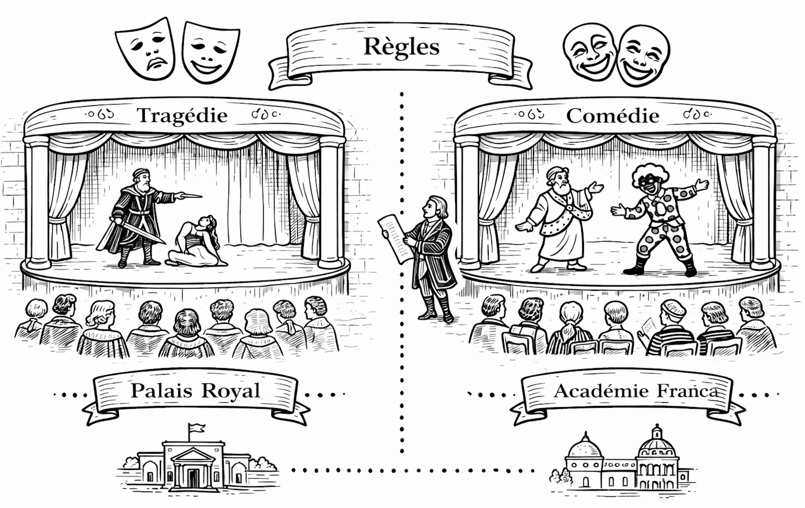 De 1630 à 1685 environ : en France, le théâtre classique codifie les genres. Tragédie et comédie obéissent à des règles précises. Le théâtre devient un art officiel, étroitement lié aux institutions et aux élites.
