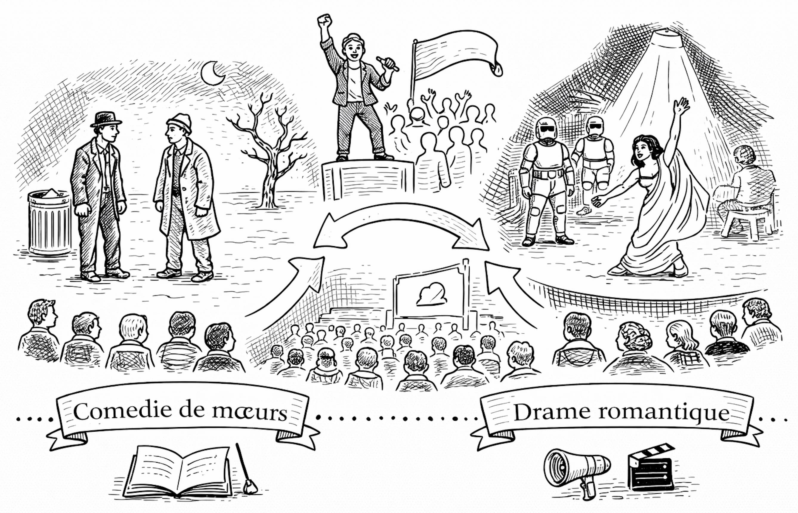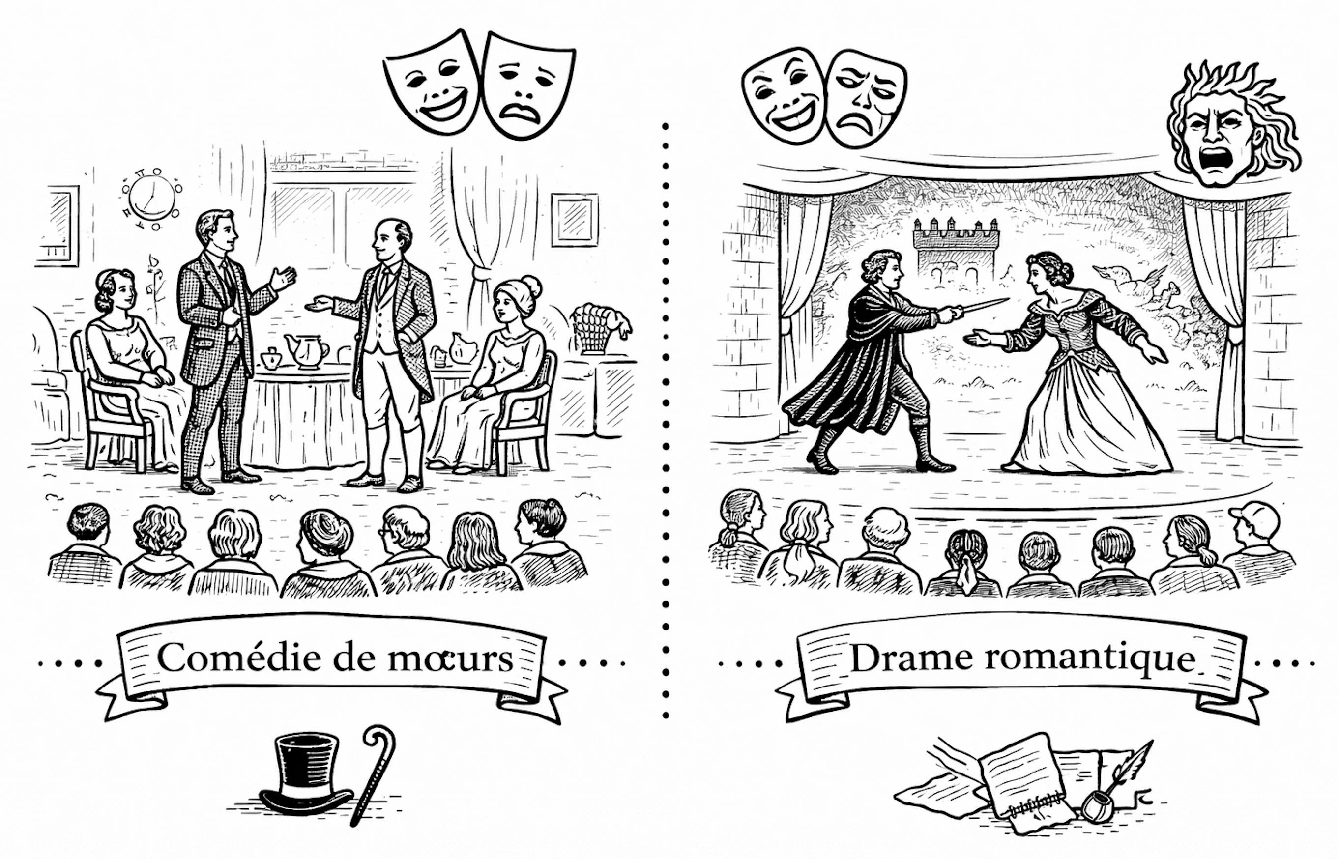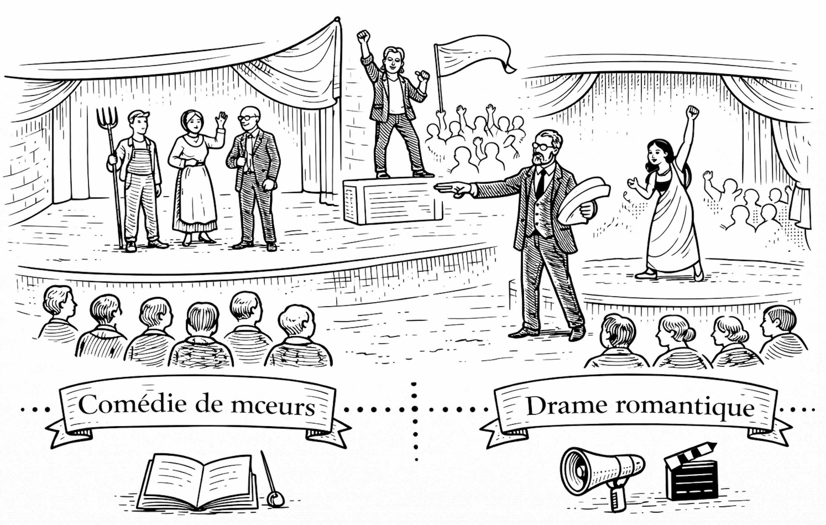De 1715 à 1850 environ : les genres évoluent vers l’observation de la société. La comédie de mœurs et le théâtre bourgeois dominent, tandis que le drame romantique rejette les règles classiques et revendique une plus grande liberté.