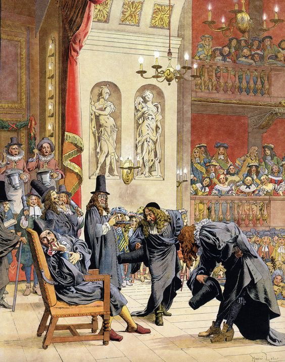 La dernière représentation de Molière (fin du 19e siècle) Maurice Leloir Maurice Leloir reconstitue la célèbre soirée du 17 février 1673, lorsque Molière, jouant Le Malade imaginaire, s’effondre après la représentation. La scène est théâtrale au sens double : sur le plateau, le jeu continue encore, mais déjà l’inquiétude gagne. Autour du dramaturge affaibli, les comédiens se pressent tandis que la salle reste attentive. Leloir, peintre scrupuleux des costumes et des décors d’époque, mêle précision historique et émotion dramatique. Ici, le théâtre devient mémoire : le rideau ne tombe pas seulement sur une pièce, mais sur une vie.