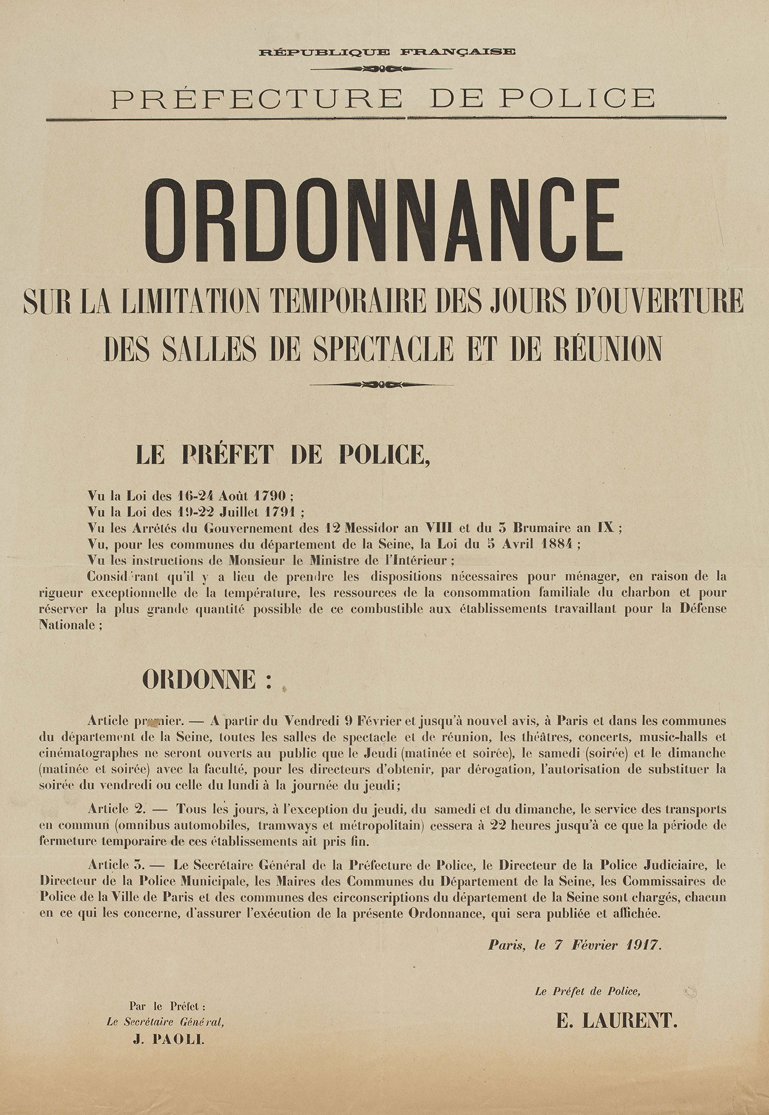 République Française. Préfecture de Police. Ordonnance sur la limitation temporaire des jours d’ouverture des salles de spectacle et de réunion. Anonyme , Imprimeur. En 1917. Musée Carnavalet.