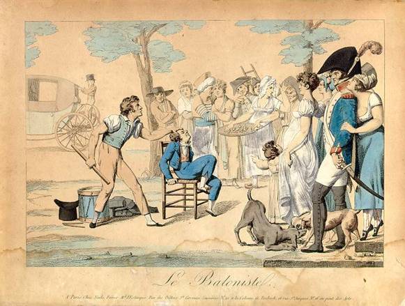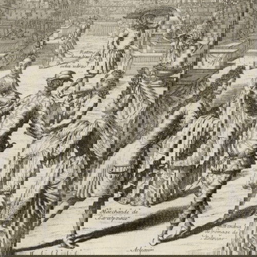 Gravure représentant une scène de spectacle et de commerce urbain. Domaine public.