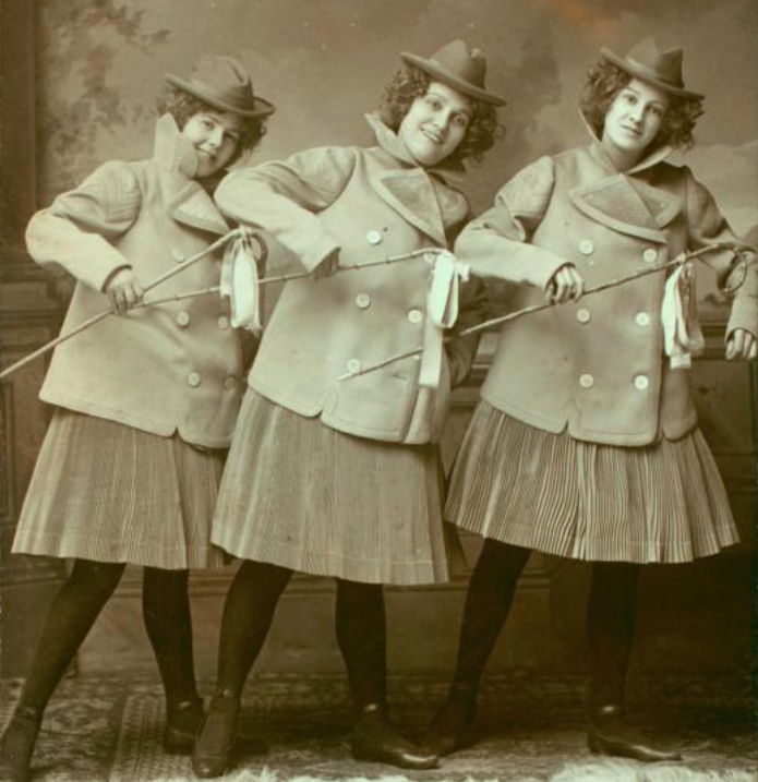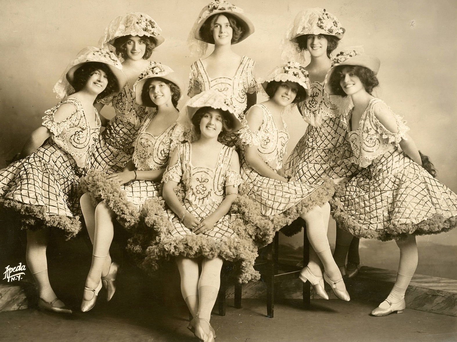 Les Palace Girls. En 1913, "Les Palace Girls" étaient un groupe de performeuses de vaudeville. Cette photographie datée du 8 juin 1913 les montre en costumes élaborés, posant pour l'appareil photo. Cette photo fait partie de la collection J. Willis Sayre de photographies théâtrales et est conservée par les bibliothèques de l'Université de Washington.
