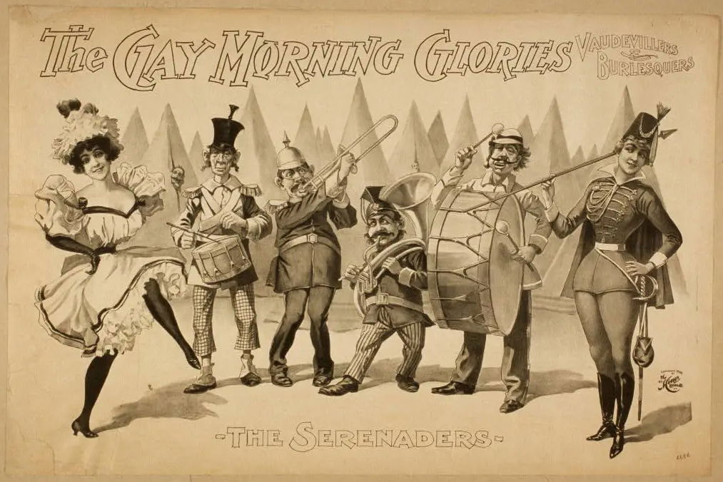 Affiche du numéro de vaudeville de 1898 The Gay Morning Glories. Vaudevillers & Burlesquers. les "Gay Morning Glories Vaudevillers & Burlesquers" étaient un groupe d'artistes de spectacle connus pour leur mélange d'actes de vaudeville et de numéros de burlesque. Ils étaient actifs à la fin du 19e siècle, autour de 1898. Leur spectacle combinait le vaudeville, une forme de divertissement populaire à l'époque comprenant divers actes (musique, comédie, acrobaties, magie, etc.), et le burlesque, un genre théâtral satirique, humoristique et souvent provocateur. Il est important de noter que le mot "gay" à cette époque avait une signification différente de celle d'aujourd'hui en référence à l'orientation sexuelle. Au 19e siècle, "gay" signifiait plutôt "joyeux", "vif" ou "plein d'entrain". Ainsi, le nom de la troupe suggérait probablement un spectacle vivant et divertissant.