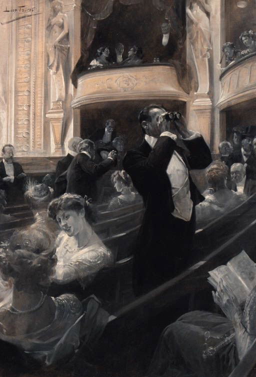 Dans cette scène élégante et animée, Jean-Joseph-Léon Fauret déplace le regard vers la salle plutôt que vers la scène. Un homme en habit, debout, observe aux jumelles tandis que d’autres feuillettent leur programme ou échangent quelques mots. Les loges sculptées et les figures en arrière-plan soulignent le raffinement du lieu. Ici, le théâtre devient un spectacle social : les spectateurs s’observent autant qu’ils regardent la représentation.