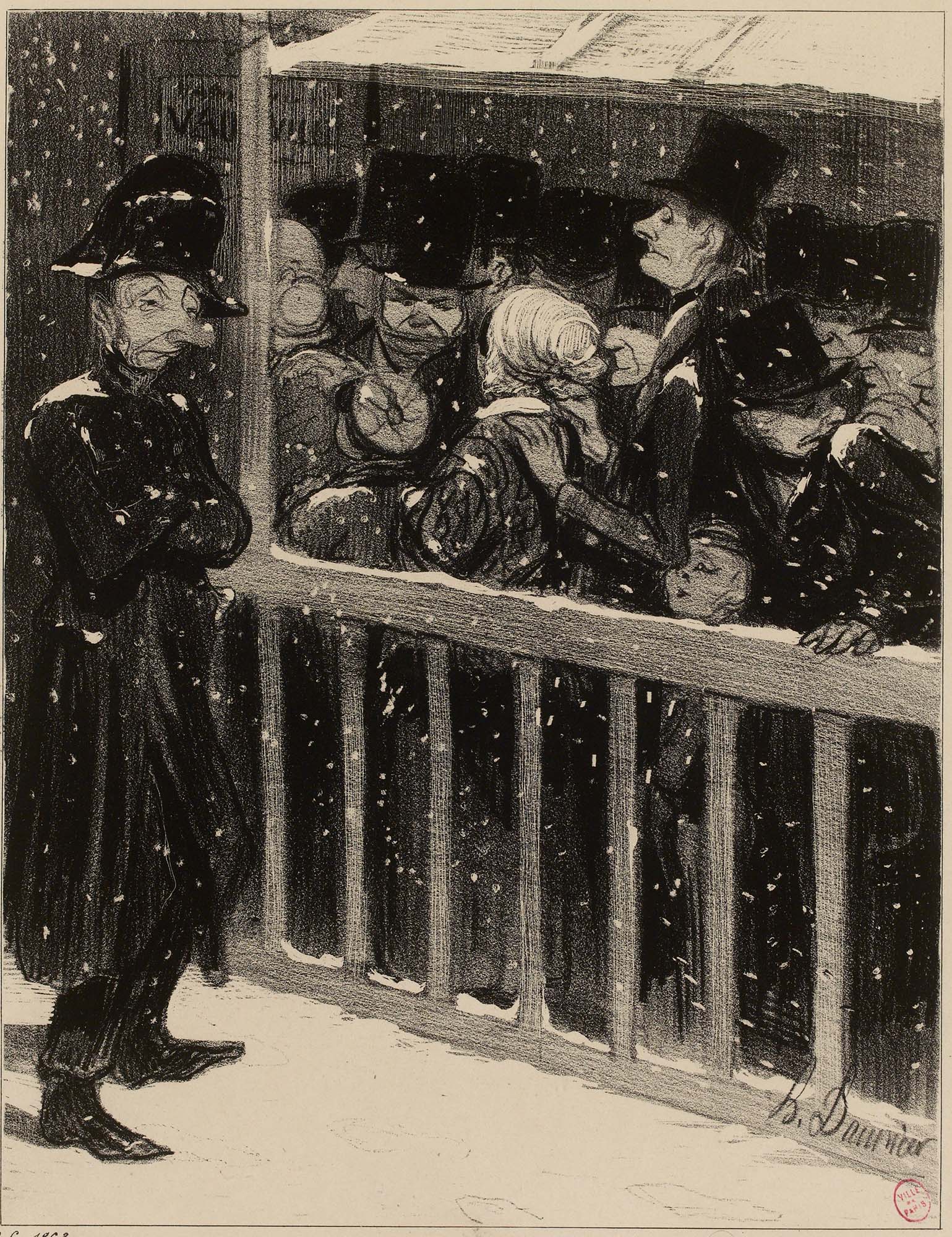 La queue au spectacle. ‘Et les sans-cœur crient contre l’autorité qui les empêche de s’écrase, et qui passe sa vie dans la neige et dans la crotte, voilà pourtant le sort des gouvernements !...’ Daumier, Honoré, Dessinateur-lithographe. Aubert (Imprimeur, lithographe, éditeur), Imprimeur-lithographe. Bauger, Éditeur. Entre 1839 et 1842. Musée Carnavalet.