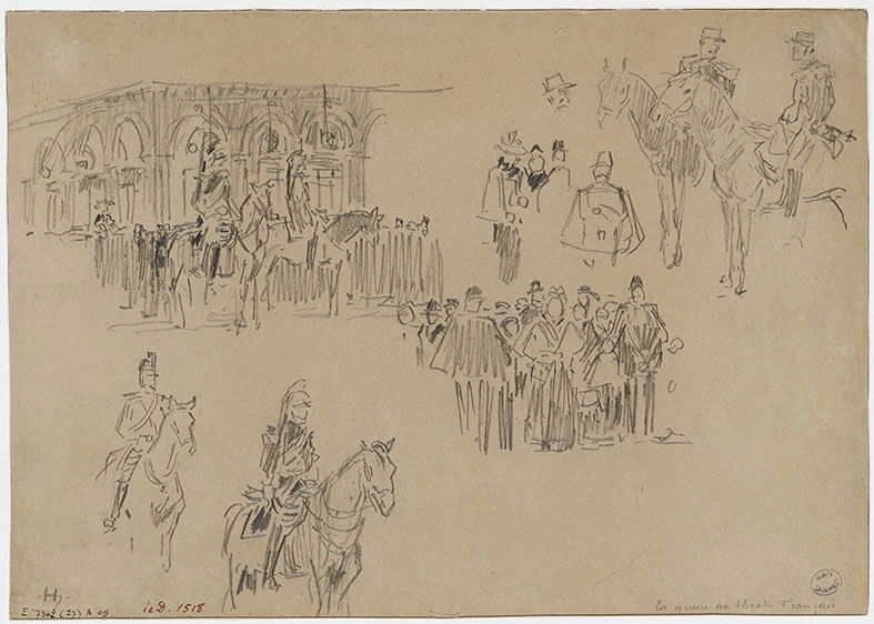 La queue devant le théâtre Français, encadrée par la garde républicaine à cheval, place du Palais Royal. 1er arrondissement Houbron, Frédéric , Dessinateur Vers 1895/1905 Musée Carnavalet, Histoire de Paris