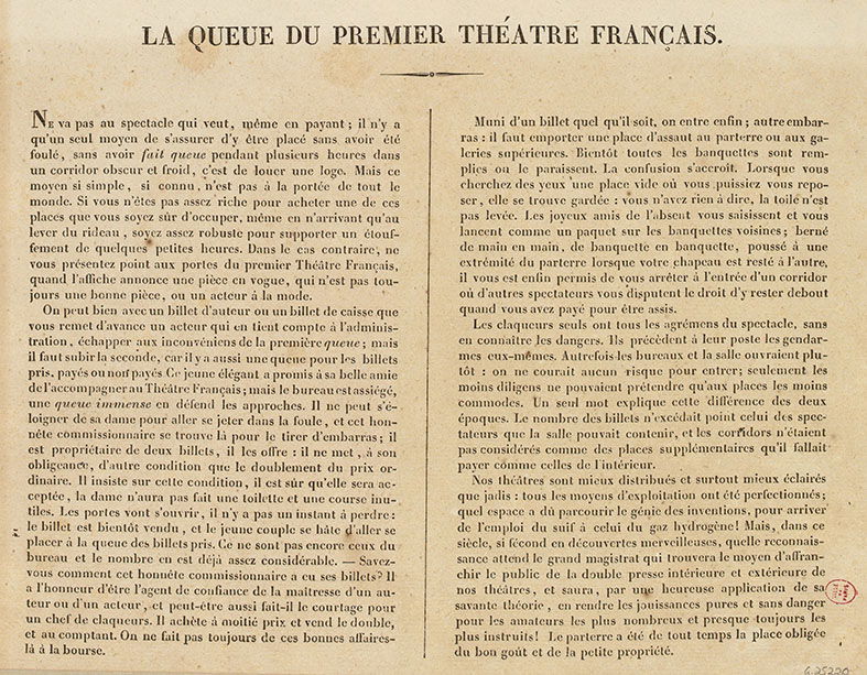 La queue est un usage à la fois ridicule et barbare, qui consiste en ceci : que les personnes qui n’ont pas le moyen de louer des places à l’avance en subissant la surtaxe qui leur est imposée, ou qui ne veulent prendre que des places qui, vu leur prix bas, ne se retiennent pas en location, viennent attendre à la porte du théâtre l’heure de l’ouverture des bureaux. C’est ce qu’on appelle faire la queue.’ Devant le théâtre sont disposées des barrières à claire-voie pour contenir ces futurs spectateurs, en leur permettant seulement de se ranger un à un ou deux par deux, à la queue leu leu. Quelque temps qu’il fasse, qu’il pleuve qu’il grêle, qu’il neige, qu’il vente, le théâtre est impitoyable, et tous ces amateurs de spectacle : hommes, femmes, enfants, sont obligés d’attendre que les bureaux veuillent bien s’ouvrir et condescendre jusqu’à accepter leur argent. Cet usage, barbare autant que ridicule, nous le répétons, est indigne d’un peuple policé. Si les administrations théâtrales avaient pour le public le respect et les égards qu’on doit toujours à ceux qui vous apportent leur argent et qui vous font vivre, elles trouveraient facilement le moyen de faire cesser un état de choses qui est bien près d’être scandaleux, et d’employer envers les spectateurs un procédé moins inique et moins grossier.