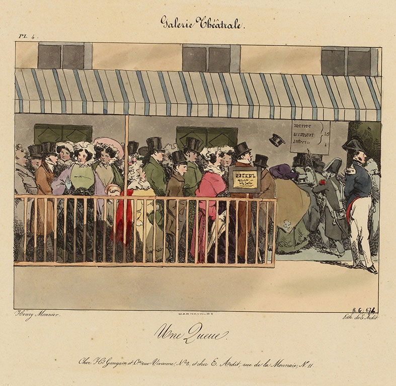 Galerie théâtrale : Une queue devant un théâtre Monnier, Henry Bonaventure , Dessinateur Gaugain, Henri-Armand Pierre , Editeur Ardit, E. , Dessinateur-lithographe Vers 1828 Musée Carnavalet, Histoire de Paris
