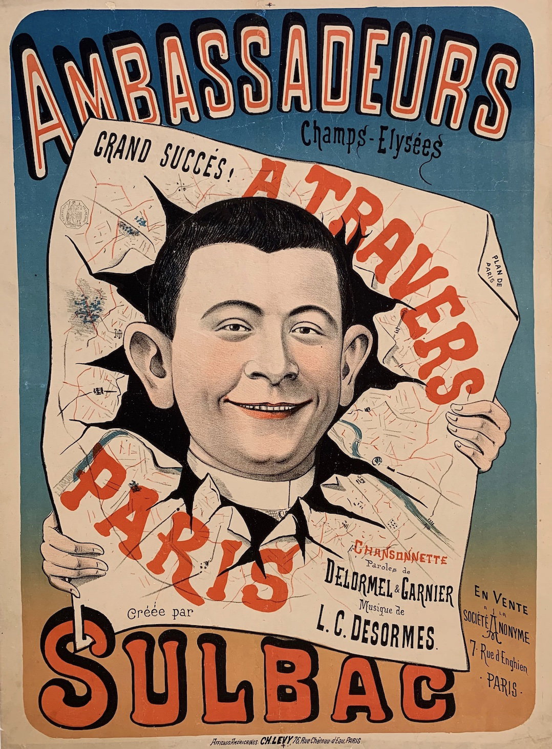 Sulbac aux Ambassadeurs (Champs-Élysées), affiche de café-concert annonçant la chansonnette À travers Paris, fin du 19ᵉ siècle.