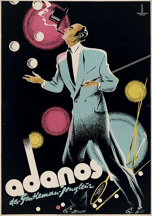 Cette affiche Art déco représente Adanos en pleine jonglerie, vêtu d’un costume moderne et dynamique. Les formes circulaires colorées et le fond sombre soulignent le mouvement, la précision et la modernité du numéro, tandis que la signature graphique (impression Van Hussen, Cologne) inscrit clairement l’œuvre dans la culture visuelle allemande des années 1920.