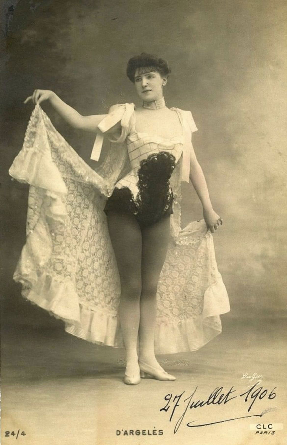 Cette photographie, datée du 27 juillet 1906, représente l’artiste D’Argelès dans une pose de scène caractéristique du music-hall de la Belle Époque. Le costume, composé d’un corset clair, de dentelles et de collants, met en valeur la silhouette et le jeu des bras, essentiels dans les numéros de danse et de pose plastique de l’époque.
