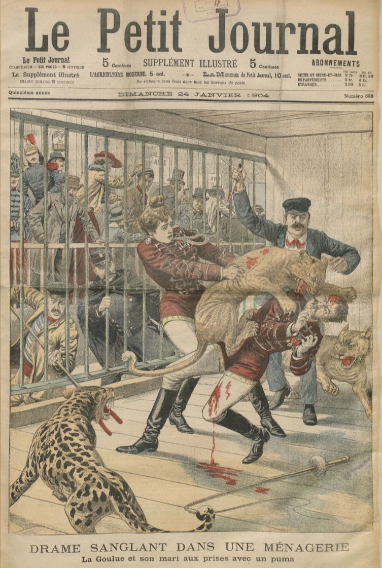 Le Petit journal. Supplément du dimanche. 1904-01-24. La Goulue et son mari attaqués par un puma. Source gallica.bnf.fr / BnF