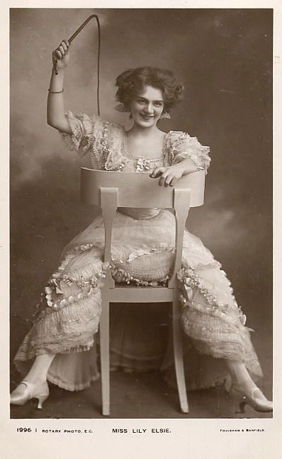 Portrait promotionnel de Lily Elsie, actrice de théâtre musical, assise à califourchon sur une chaise et tenant une cravache, dans une pose espiègle typique de l’imagerie de la musical comedy édouardienne. Le cliché illustre la diffusion photographique des stars de scène au début du XXᵉ siècle.