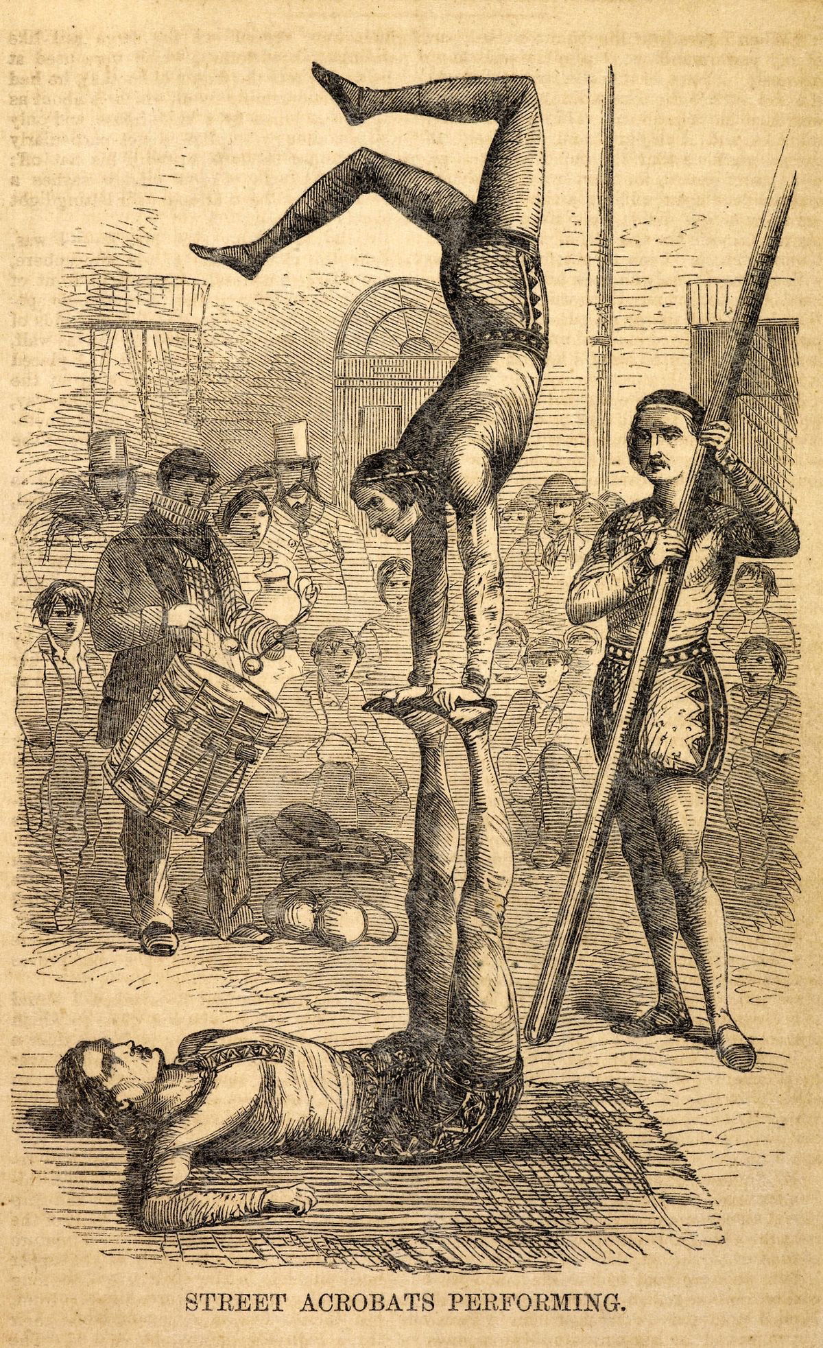Performance d'acrobates de rue. (Vers 1850)