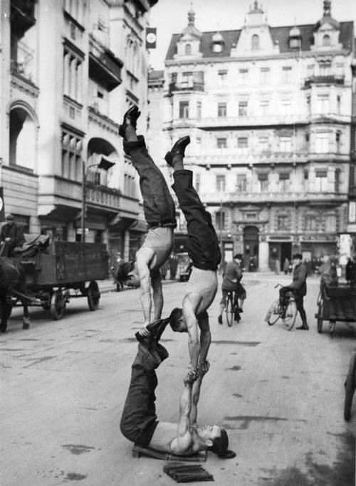 En 1933, au cœur de Berlin, trois acrobates improvisent leur piste au milieu de la chaussée. Sans chapiteau ni décor, ils transforment la rue en scène, défiant la gravité sous le regard des passants, des cyclistes et des voitures à cheval. Leur pyramide humaine, dressée sur quelques planches posées à même le pavé, rappelle qu’avant les grandes salles et les projecteurs, l’art acrobatique vivait d’abord au coin des rues, dans l’équilibre fragile entre prouesse physique et nécessité quotidienne.