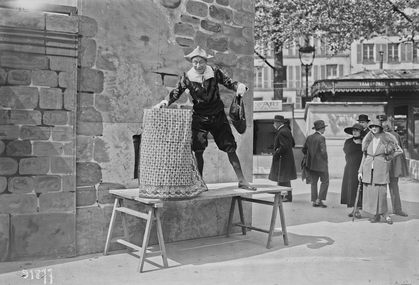 Un saltimbanque à la Foire Saint-Germain – 1924 En 1924, lors de l’inauguration de la Foire Saint-Germain, un artiste de rue improvise son théâtre sur une simple planche posée sur des tréteaux. Costume, gestes amples, sourire malicieux : le spectacle tient à peu de choses, sinon à la présence. Autour de lui, les passants observent, mi-curieux, mi-amusés. La rue reste alors une scène à part entière, où les saltimbanques perpétuent une tradition bien plus ancienne que les théâtres de pierre.