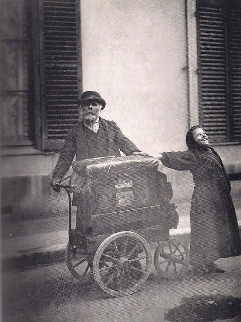 Fin 19ᵉ – début 20ᵉ siècle : cette photographie montre un couple d’artistes ambulants, probablement forains ou musiciens de rue, parcourant la ville avec leur carriole. Les vêtements, le matériel et le style du tirage situent l’image autour de 1890–1910, à une époque où le spectacle populaire se déployait encore directement sur le pavé, au contact du public.