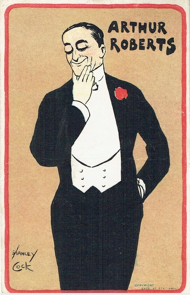 Carte postale promotionnelle pour Arthur Roberts (1852-1933) par Stanley Cock Cachet de la poste du 4 mai 1907.
