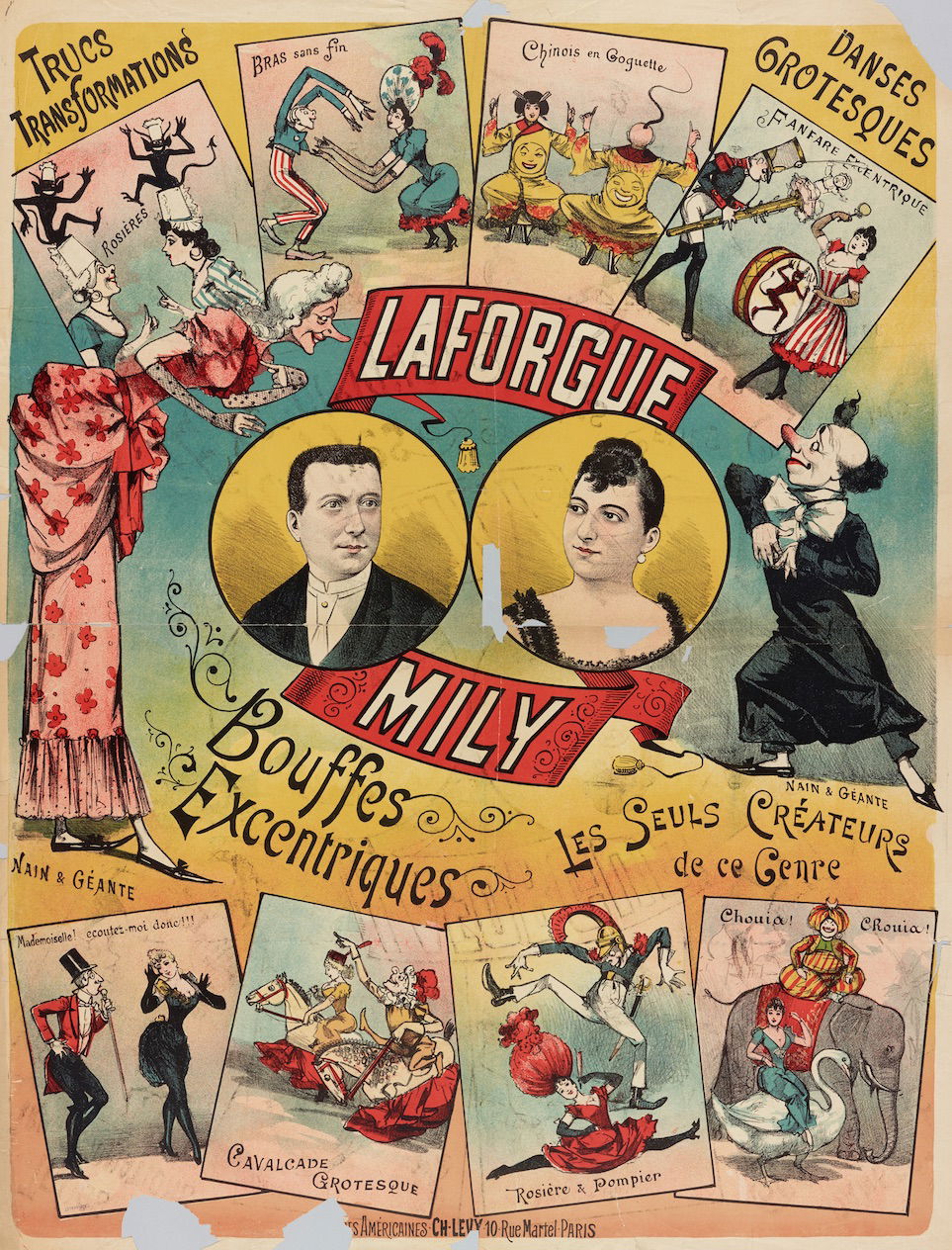 Après 1888 : À la fin du 1800, les scènes parisiennes raffolent des numéros dits « excentriques ». L’affiche de Laforgue et Mily, imprimée par Charles Lévy à Paris, en est une parfaite illustration. On y promet « Trucs. Transformations. Danses grotesques ». Tout un programme. Le terme « bouffes excentriques » désigne alors des spectacles mêlant parodie, travestissement, caricature et fantaisie visuelle. Les artistes jouent sur la transformation rapide, les contrastes physiques, les déformations comiques. Nain et géante, cavalcade grotesque, fanfare extravagante : le rire naît du décalage et de l’outrance. Ces numéros appartiennent pleinement à l’univers des artistes de variété. Ils reposent sur l’efficacité du numéro pur : quelques minutes, une idée forte, un effet visuel immédiat. Pas de grand décor, pas de drame structuré. L’art est dans la surprise, dans la mécanique du comique, dans la virtuosité de l’enchaînement. Ce type de spectacle circule entre cafés-concerts et premières salles de music-hall. Les catégories ne sont pas encore figées. Un même duo peut se produire dans une salle de quartier puis dans un établissement plus vaste, selon le succès rencontré. L’affiche, colorée et foisonnante, reflète ce monde du divertissement populaire : mouvant, inventif, parfois jugé frivole, mais d’une redoutable efficacité scénique. Ici, la variété ne signifie pas dispersion. Elle signifie diversité assumée, transformation constante et liberté de ton. Un art du numéro, vivant, direct, conçu pour capter l’attention dès la première seconde.