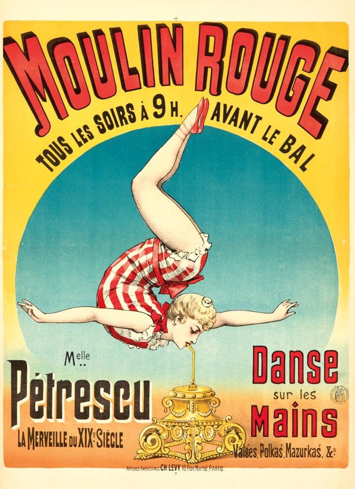 Cette affiche lithographiée, datable des années 1890, est une affiche promotionnelle réalisée pour le Moulin Rouge, annonçant les représentations quotidiennes de Mlle Pétrescu. Imprimée par Ch. Lévy (Paris), comme indiqué sur l’affiche, elle met en scène l’exploit acrobatique dans une composition spectaculaire, destinée à capter immédiatement le regard des passants.