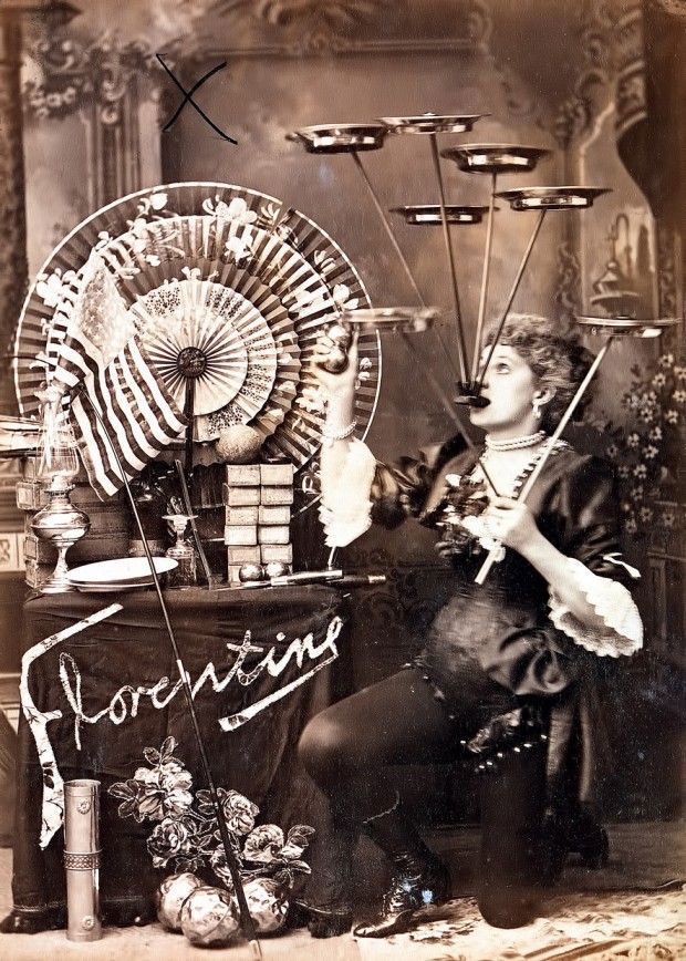 Vers 1890–1910 : Sur les scènes des cafés-concerts et des premières salles de music-hall, certains artistes captivent le public sans dire un mot. Florentine appartient à cette famille-là. Son numéro repose sur une prouesse simple en apparence : faire tourner et tenir en équilibre plusieurs assiettes au sommet de longues tiges souples, tout en conservant grâce et maintien. La photographie promotionnelle la montre concentrée, élégante, en costume de scène soigné. Rien d’exotique ni de grotesque ici : l’effet naît de la précision. Les plateaux tournent, frémissent, menacent de chuter. Le suspense fait partie du spectacle. Chaque mouvement est calculé, chaque geste retient l’attention.