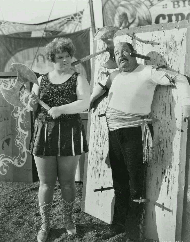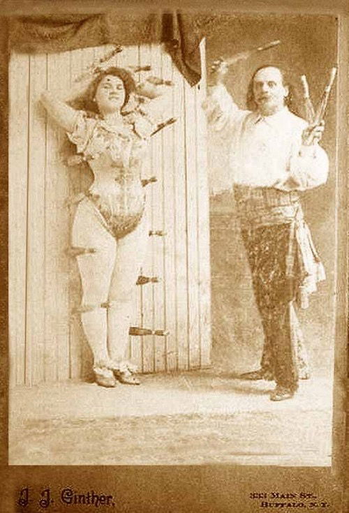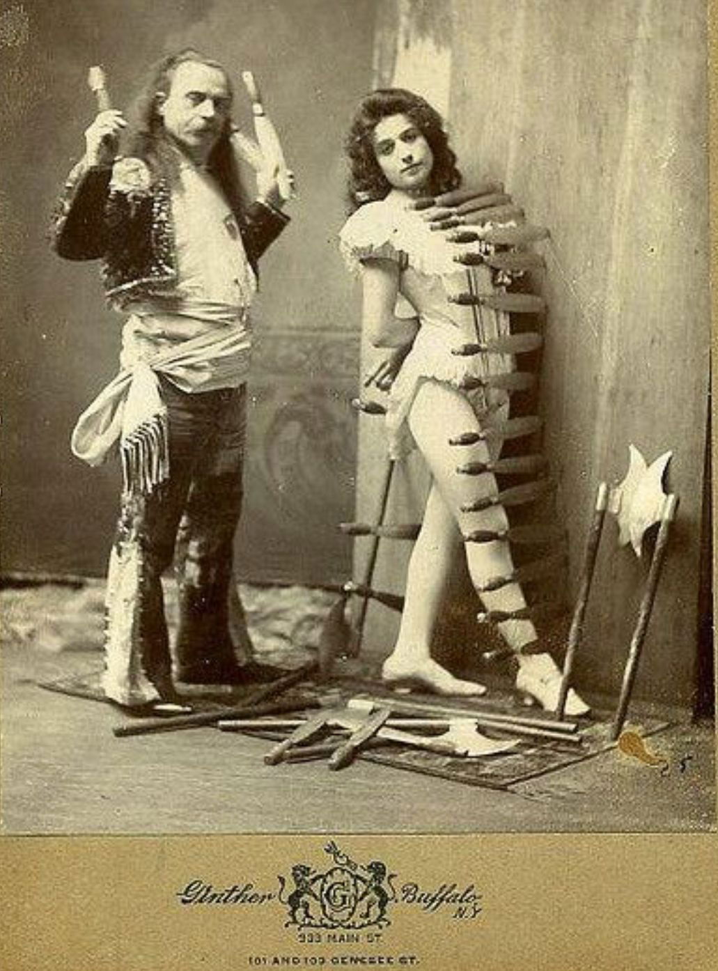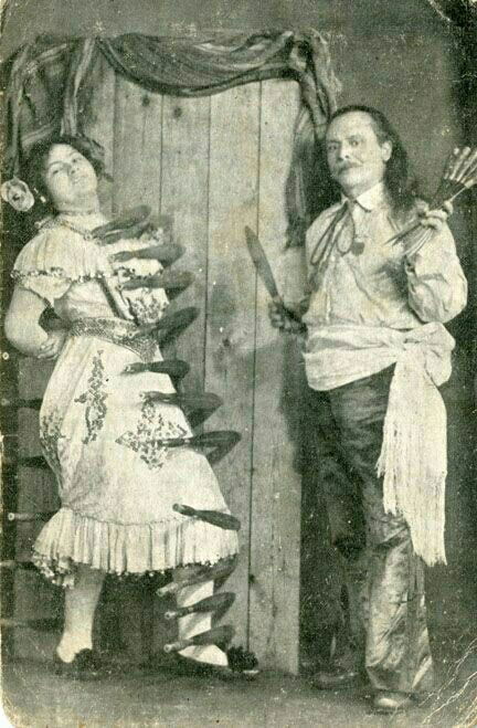 Le numéro présenté appartient à la tradition spectaculaire dite de la “knife throwing act” :
