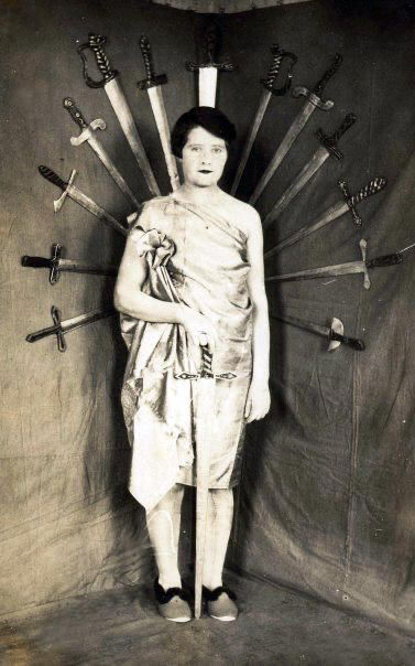 Cette photographie semble s’inscrire dans l’esthétique des spectacles forains et du vaudeville du début du 20e siècle, période où les numéros d’arts du risque étaient souvent mis en scène avec une forte dimension visuelle et symbolique. L’artiste pose devant un éventail d’épées disposées en halo derrière elle. Il s’agit très probablement d’une composition de studio destinée à évoquer la maîtrise du danger plutôt qu’un instant capté en pleine performance. L’appellation « The Sword Maiden » ou un rattachement à une troupe spécifique (type Walters) circule parfois dans certaines archives ou bases iconographiques, mais ces identifications demandent confirmation documentaire solide (affiche, programme, mention nominative). L’esthétique drapée, inspirée de l’Antiquité, correspond à une pratique fréquente dans les spectacles du tournant 1900–1930 : donner aux numéros d’armes une dimension « artistique » ou « classique », plus noble que la simple attraction foraine.