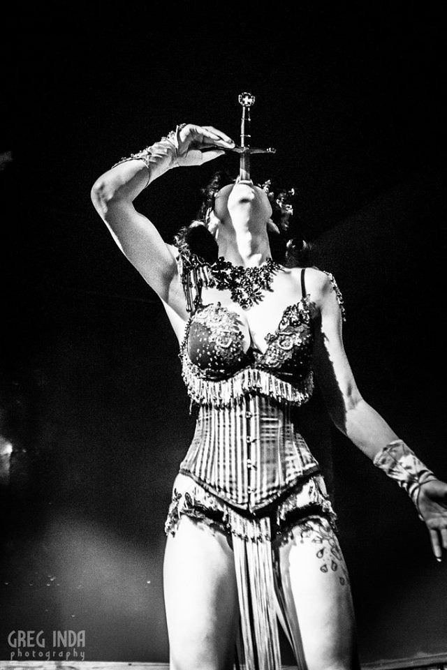 Dans l’éclat des projecteurs contemporains, l’artiste connue sous le nom de scène Sally the Swallower perpétue une tradition dont les origines remontent à l’Antiquité. Capturée par l’objectif de Greg Inda, elle incline la tête vers l’arrière pour aligner parfaitement la gorge et permettre à la lame d’acier de descendre, geste d’une précision extrême qui défie l’instinct même de protection du corps. Vêtue d’un costume inspiré à la fois du cabaret et de l’esthétique burlesque, corset rayé, ornements scintillants, bijoux de scène, elle transforme un acte fondé sur le risque réel en une performance visuelle presque chorégraphiée. À la différence des numéros de lancer de couteaux du tournant du XXᵉ siècle, l’avalage de sabre repose entièrement sur la maîtrise interne : contrôle de la respiration, relâchement musculaire, discipline répétée jusqu’à l’extrême précision. Ce cliché suspend un instant de concentration absolue. La grâce du costume contraste avec la froideur métallique de la lame. L’art de l’avalage de sabre demeure aujourd’hui encore l’une des disciplines les plus fascinantes — et les plus périlleuses — du spectacle vivant.