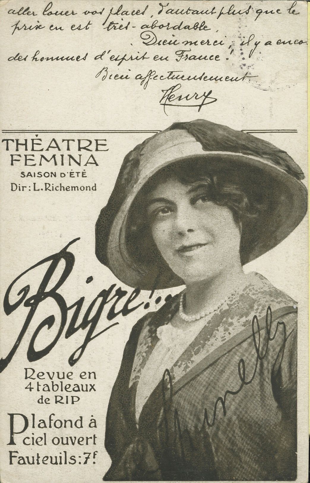 Correspondance (Recto/Verso) : ‘ Cher ami, Nous avons été hier soir entendre la nouvelle Revue de Rip, c’est un bijou de verve, d’esprit et de parisianisme. Tout Paris était du reste dans ce salon qu’est le Théâtre Fémina loué par M. Richemond pour la saison d’été, et où il régnait une fraicheur délicieuse, grâce au plafond qui s’ouvre à volonté. Les femmes sont élégantes et jolies. Les acteurs d’une drôlerie irrésistible. Les décors et les costumes ravissants. N’hésitez pas à aller louer vos places, d’autant plus que le prix en est très abordable. Dieu merci, il y a encore des hommes d’esprit en France ! Bien affectueusement. Henry’ Dédicasse de’ Andrée Spinelly’