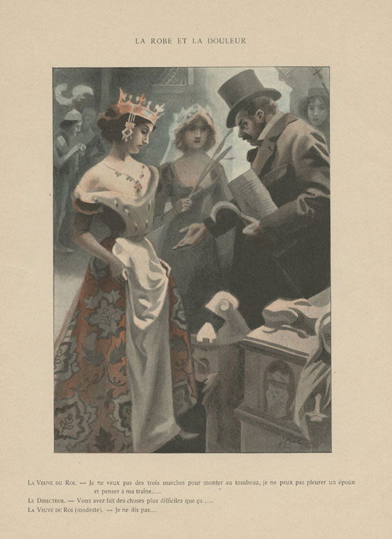 La robe et la douleur La veuve du roi. - je ne veux pas des trois marches pour monter au tombeau, je ne peux pas pleurer un époux, et penser à ma traîne…. Le directeur. Vous avez fait des choses plus difficiles que ça…. La veuve du roi (modeste). Je ne dis pas....