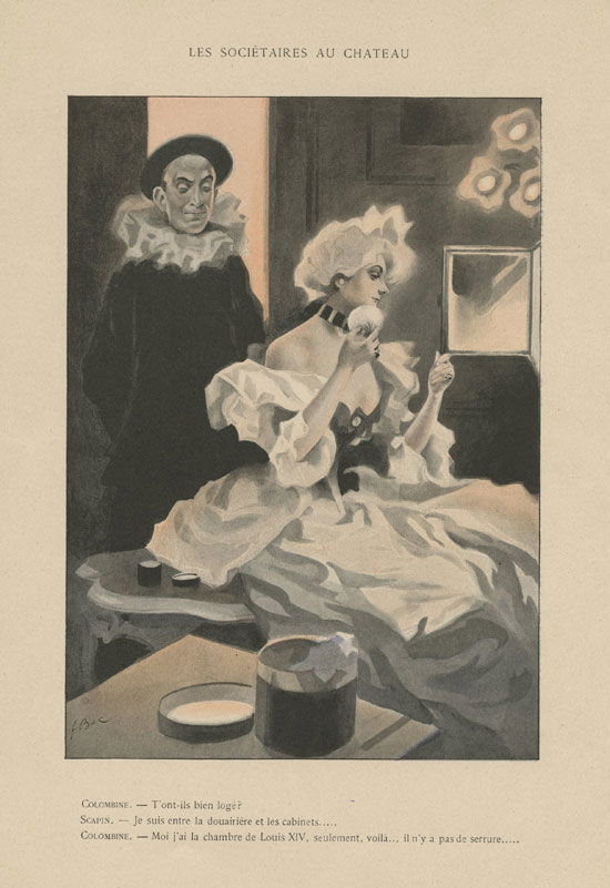 Les sociétaires au château Colombine : T'ont-ils bien logé ? Scapin : Je suis entre la douairière et les cabinets…. Colombine : Moi j'ai la chambre de Louis XIV, seulement, voilà... Il n'y a pas de serrure….