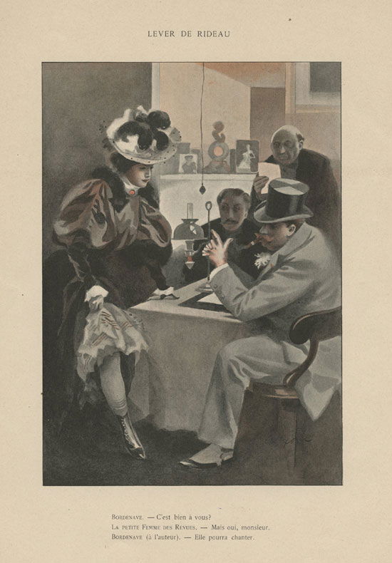 Lever de rideau Bordenave : C’est bien à vous ? La petite femme des revues : Mais oui, monsieur Bordenave (à l’auteur) : Elle pourra chanter.