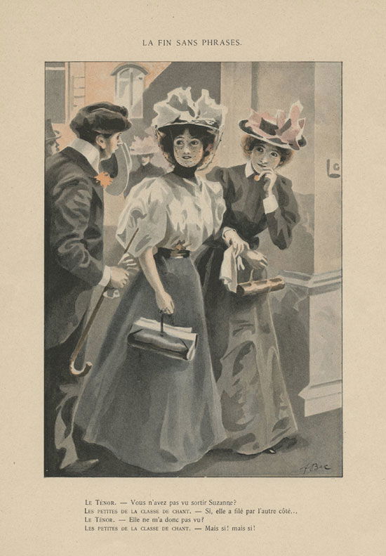La fin sans phrases Le ténor : Vous n’avez pas vu sortir Suzanne ? Les petites de la classe de chant : Si, elle a filé par l’autre côté… Le ténor : Elle ne l’a donc pas vu ? Les petites de la classe de chant : Mai si, mais si !